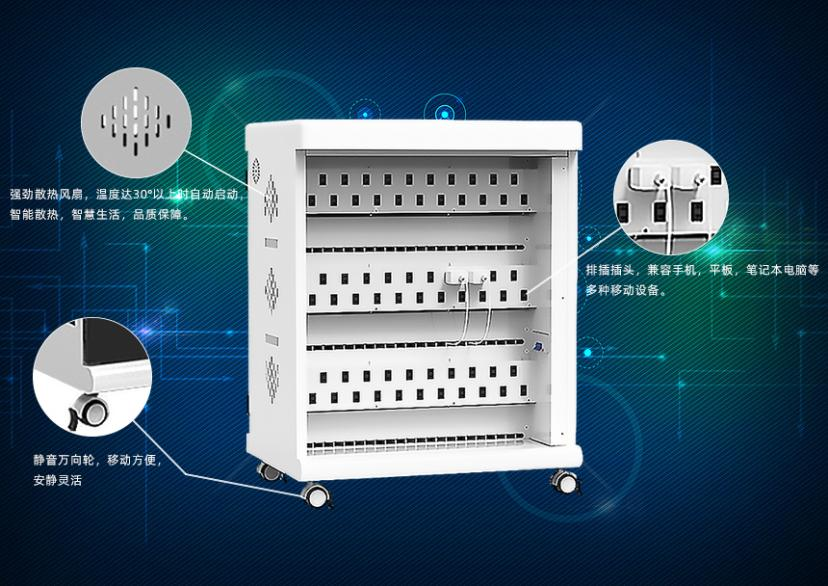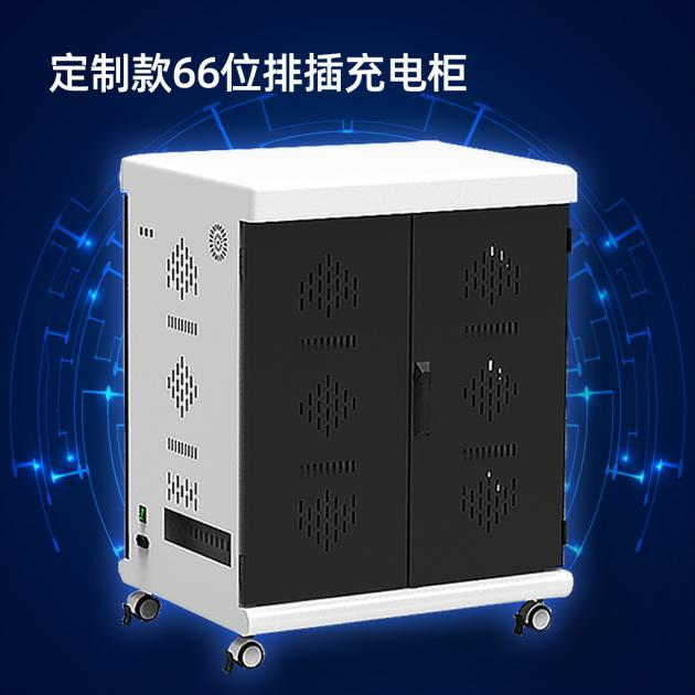 英創思EP66-A型排插充電柜整個機身使用精選鈑金打造,機體結構符合人體工學,簡潔美觀。前置充電隔板采用阻燃材料,外加強排式散熱風扇,使充電變得十分安全。推動滑輪采用靜音式萬向輪,散熱風扇也進行了降噪處理,使得使用環境可以十分安靜。
