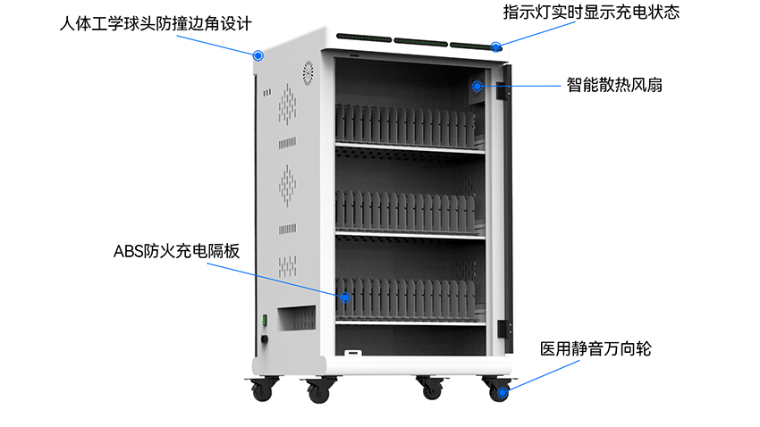ABS防火隔板的設計,進一步提高了平板充電柜的散熱能力增強了安全性,并且隔板采用塑膠材質,可以防止劃傷電子設備。